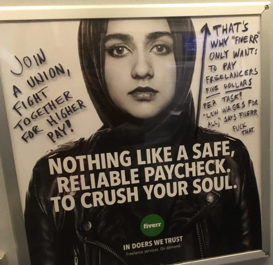One New Yorker famously went around tagging every Fiverr ad they could find on the Subway with labor rights commentary.
