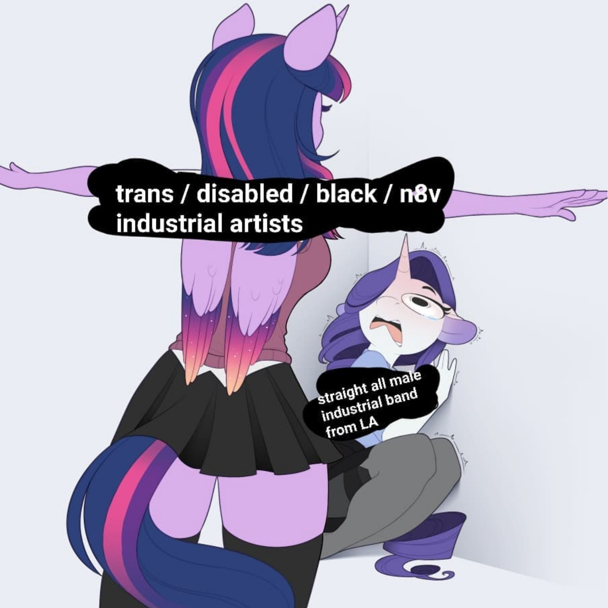 And in those “heavier” spaces, artists like Dreamcrusher and Black Dresses make a name on the noisier-side of this “chaos-trans” scene as well. This scene is particularly interesting to me because it represents another large zone of conflict with hxstorically hyper-masculine performance. Noise and industrial music has a complex lineage, but I think this meme from Devi McCallion of Black Dresses really sums up the current situation best. It shows one, what appears to be a humanoid My Little Pony, blocking another scared humanoid-pony from passing. The blocking pony reads “trans/disabled/black/n8v industrial artists” and the pony being blocked says “straight all male industrial band from LA.” As Jill Lloyd Flanagan of Forced into Femininity says “…it does seem that a lot of us came out of the noise scene but felt, because of the misogyny, to create sonic and performative distance from that world was a good idea.” There has been a long & committed project to distance queer forms of noise & industrial music from this large contingent of the scenes.